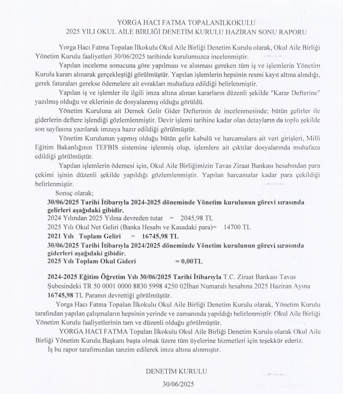Okul Aile Birliği Hesap Dökümü 30.06.2025
